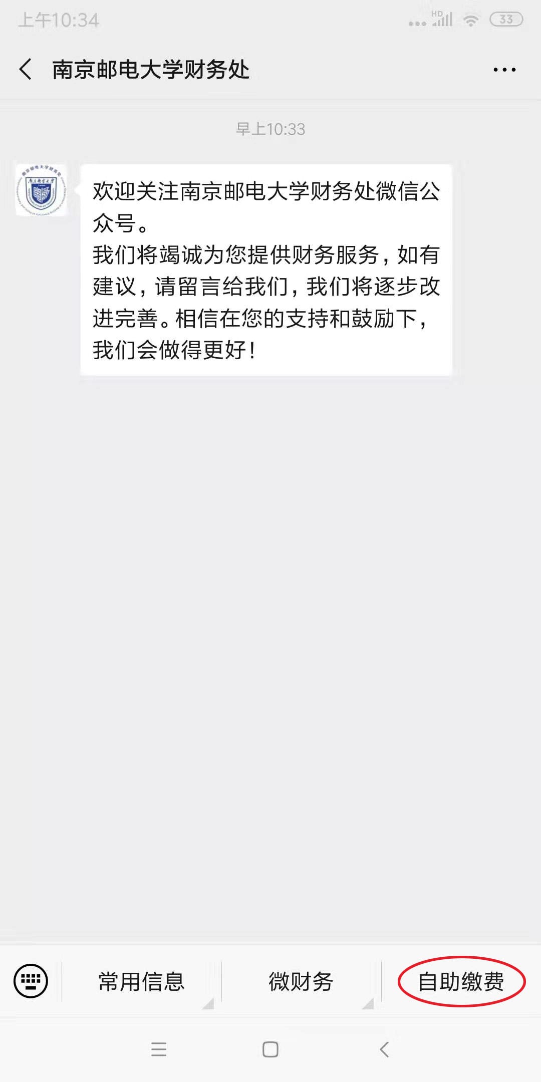 同学们可关注“太阳成集团122ccvip财务处”微信公众号,点击主菜单右下角的自助缴费,进入系统选择要缴费的收费项进行缴费。所有员工均已自动注册,无须自己注册,可以直接登陆。