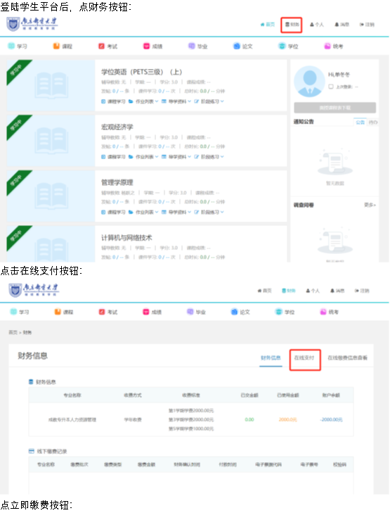 太阳成集团122ccvip高等学历继续教育员工缴费方式采用弘成平台线上缴费,平台登陆地址:http://njupt.sccchina.net/,使用电脑客户端缴费建议用谷歌浏览器,员工用学号登录,密码是身份证后六位,按照操作流程(见下图)提示进入弘成平台,系统将自动显示应缴费金额,感谢您的配合!