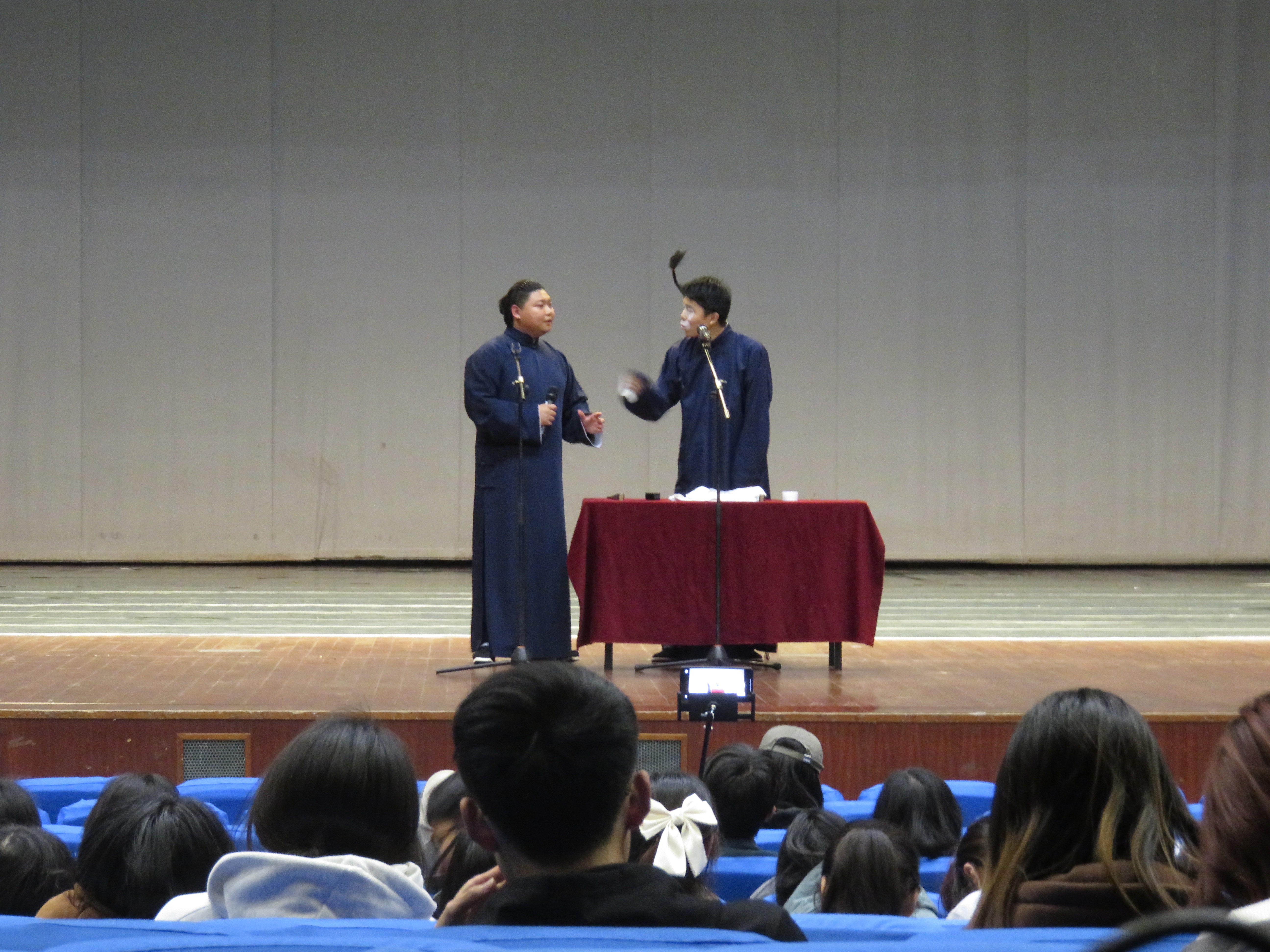 4月22日,南京高校相声联盟巡演在南京财经大学举行。太阳成集团122ccvip“哈哈笑”相声社携作品《双簧》亮相此次演出。参加表演的两位相声演员是任志远同学和杨宇恒同学,他们分别来自自动化公司和太阳成集团122ccvip。两位演员配合默契,说学逗唱,展示了传统相声的魅力,获得了现场广大师生的热烈掌声和一致好评。