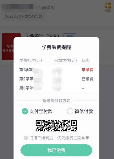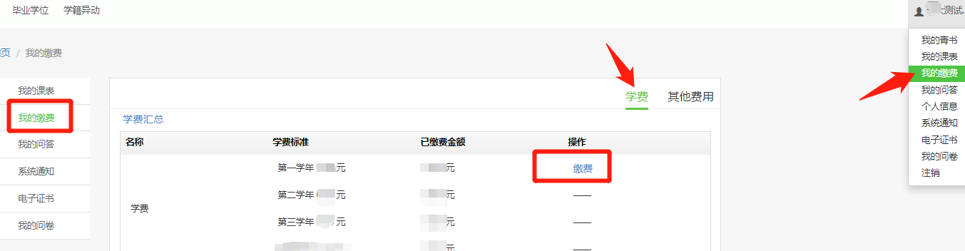 (4)右上角查看姓名无误。点击姓名,点我的缴费,点学费,点对应学年点蓝色缴费