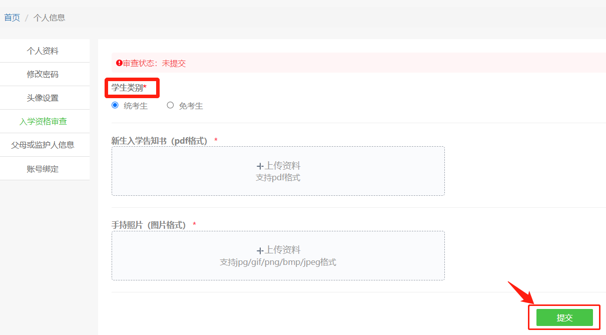 选择自己的考生类别,进行材料上传,完成后点击提交。