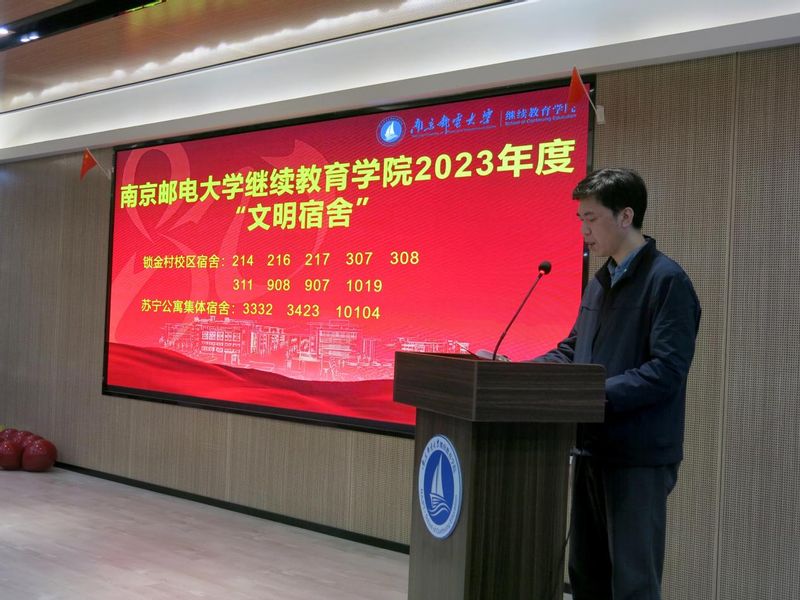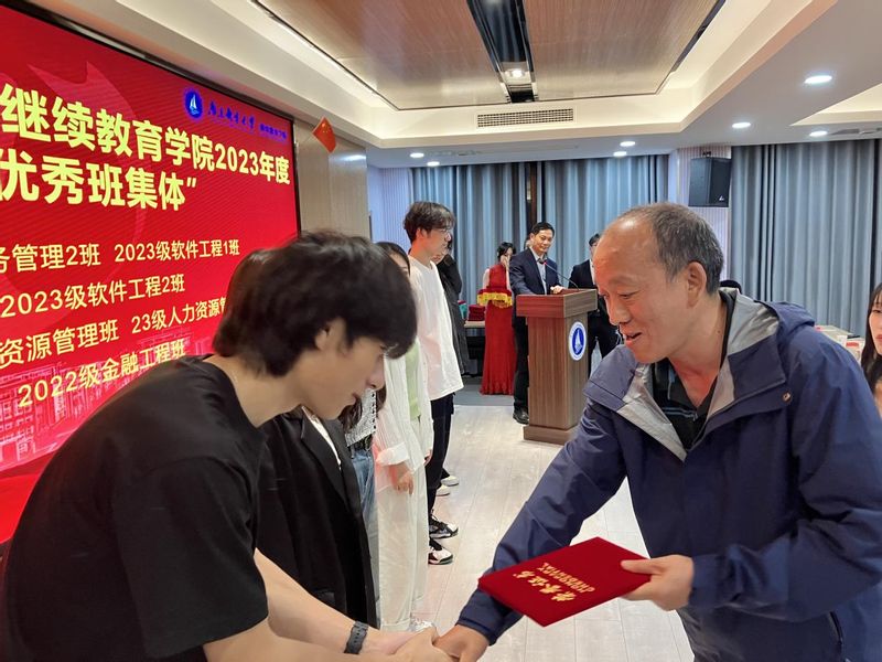 大会在庄严的国歌声中拉开帷幕。会上,党委副书记饶林果宣读了《关于表彰2023年度“优秀班集体”和“优秀员工干部”的决定》、《关于表彰2023年度“优秀班主任”的决定》、《关于表彰2023年度“文明宿舍”的决定》;副经理秦桂娟宣读了《关于表彰自考助学本科二学历2023-2024学年“优秀员工干部”的决定》。党委书记杨道林为受到表彰的优秀班主任、优秀班集体代表颁发了荣誉证书;党委副书记饶林果、副经理秦桂娟为受到表彰的全体优秀员工干部颁发了获奖证书;员工管理部主任杨秀成、副主任余静为受到表彰的12个文明宿舍代表颁奖,全体院领导与获奖的老师和同学合影留念。